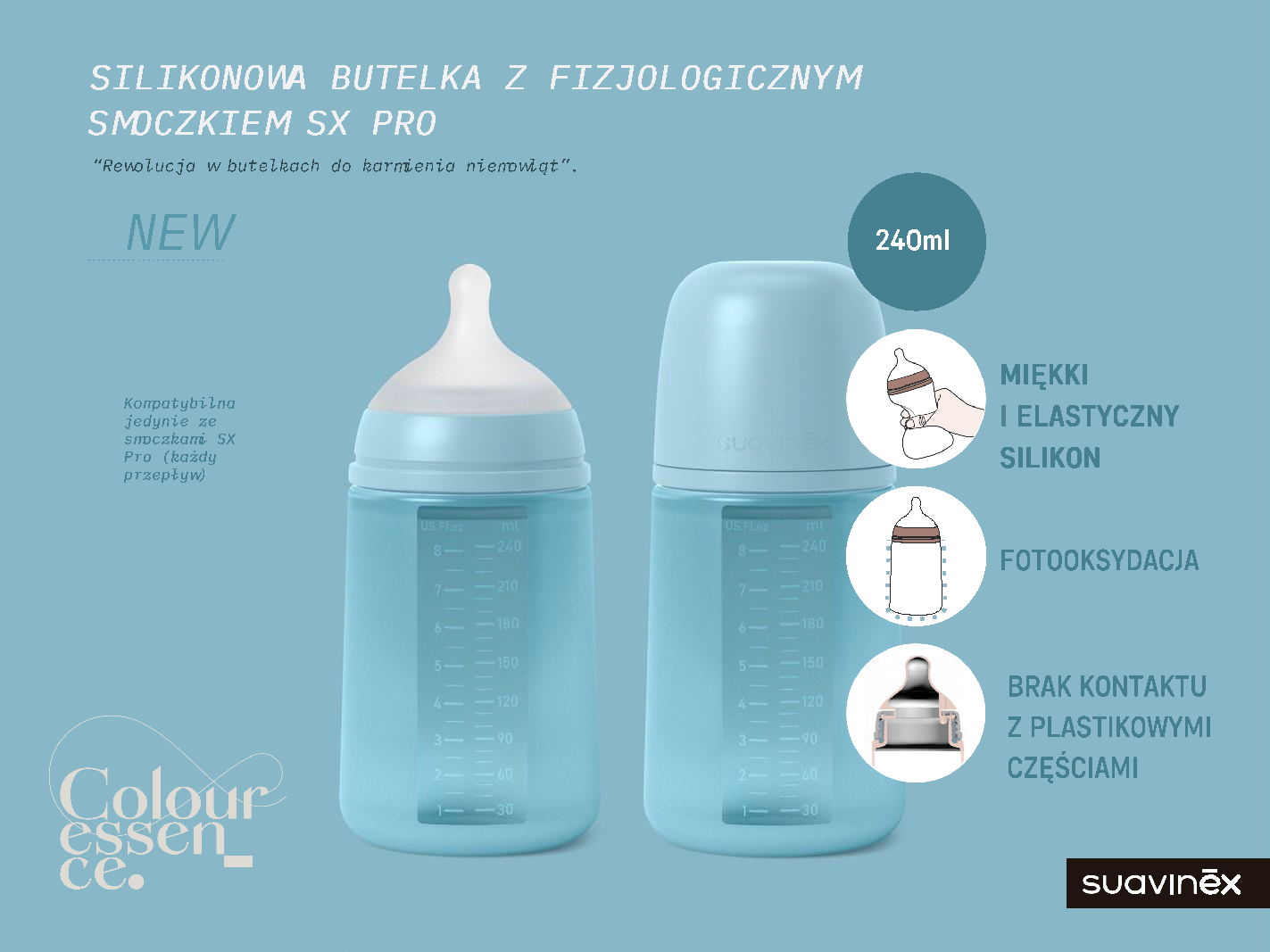 Butelki Colour Essence wykonane są z super miękkiego, bezpiecznego silikonu medycznego – bez kontaktu z plastikiem. Dzięki aksamitnemu wykończeniu są przyjemne w dotyku, wspierają rozwój sensoryczny dziecka i ułatwiają samodzielne trzymanie już od 3. miesiąca życia.
