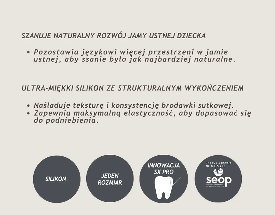 Fizjologiczny smoczek SX Pro o wolnym przepływie został opracowany tak, aby wspierać prawidłowy rozwój jamy ustnej dziecka i zapewniać odczucia jak najbardziej zbliżone do karmienia piersią. Płaski i symetryczny kształt pozwala językowi maluszka naturalnie spoczywać, sprzyjając prawidłowemu ssaniu i oddychaniu. Dłuższa szyjka sięga połączenia między podniebieniem twardym a miękkim, odzwierciedlając naturalną pozycję piersi mamy. Wklęsła, zaokrąglona podstawa dodatkowo wspiera prawidłowe ułożenie języka i szczęki, a elastyczny, ultramiękki silikon imituje fakturę i elastyczność brodawki sutkowej.
