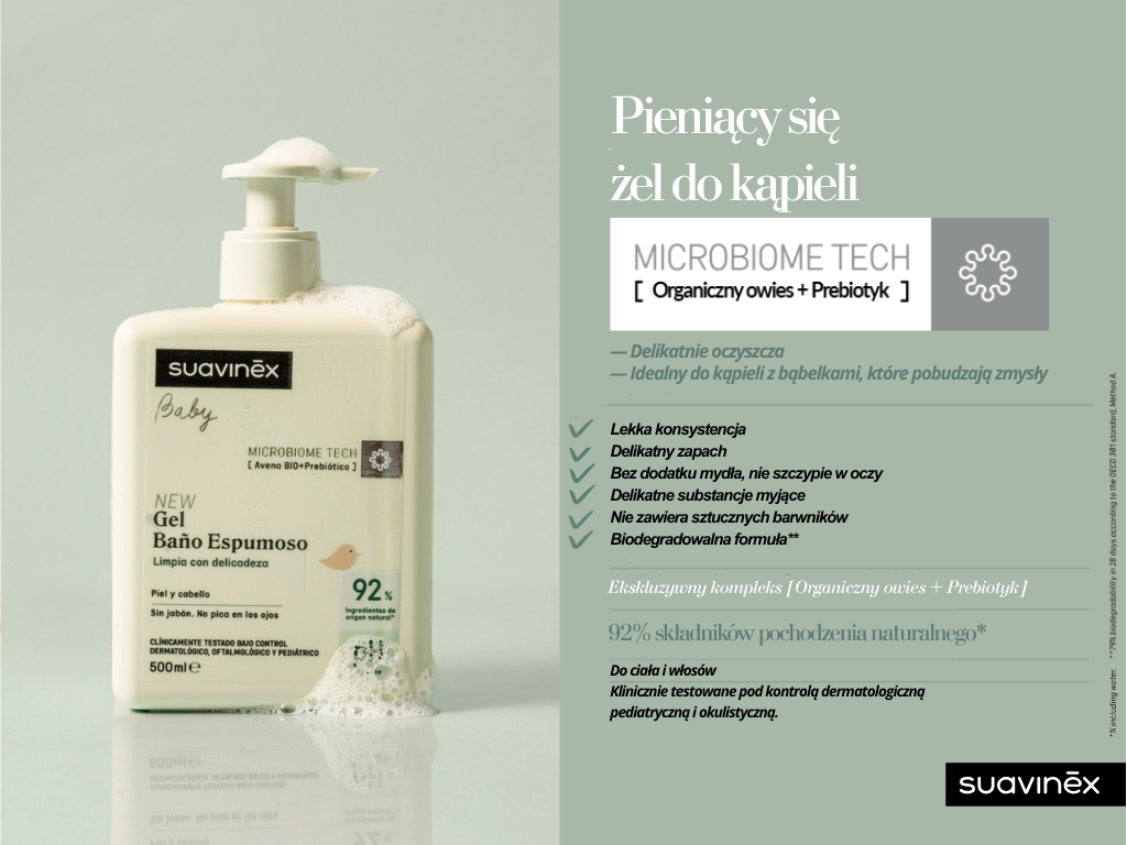 Delikatny żel do kąpieli Suavinex otula skórę dziecka miękką pianą, pozostawiając ją czystą, nawilżoną i pełną świeżości. Naturalne składniki i innowacyjny kompleks MICROBIOME TECH wspierają równowagę skóry, dbając o jej ochronę już od pierwszych dni życia. To codzienny rytuał, który łączy troskę o higienę z chwilą relaksu i bliskości.