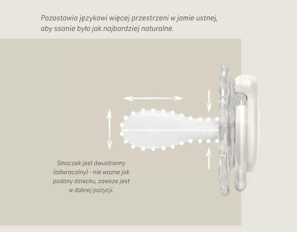 Zaprojektowany z poszanowaniem naturalnego układu jamy ustnej noworodka i aby zapewniał jak najbardziej naturalne uczucie - jakby dziecko nie używało smoczka.